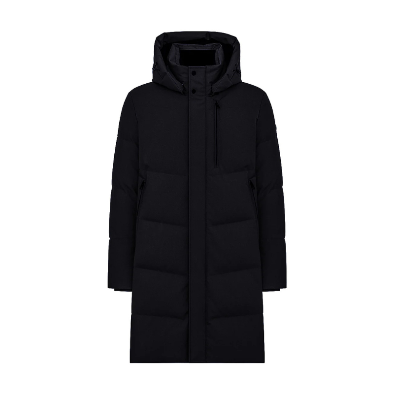 Quilted parka in wool-like 3-Layer fabric with down padding. At the bottom the garment is characterized by side openings with zipper to adjust its fit and a detachable hood with a zipper, fixed at the front collar with hidden snaps and adjustable at the hemline with a hidden drawstring; neoprene embossed logo detail on the back of the collar. Double front closure with double-slider zipper and leather zip puller with snap buttons applied on the tape. Zipper closure both for side and chest pockets and technical knit inner cuff. On the inside, multi-functional pockets, reflective details and straps that allow the garment to be carried over the shoulder.
