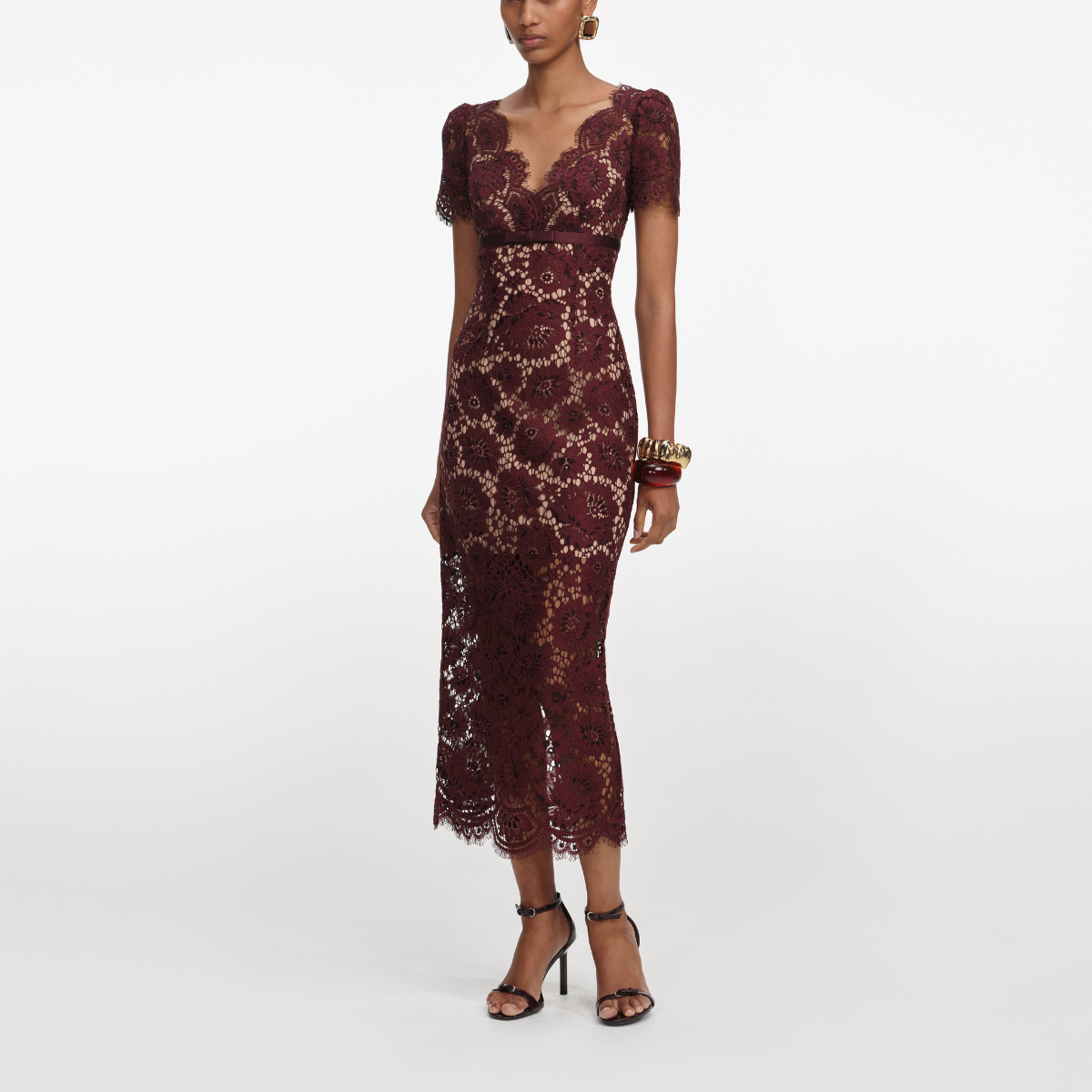 Channel timeless elegance in this burgundy lace midi dress. Its V-neckline is accented by a bow motif – show off the fit-and-flare silhouette with a pair of heels at the next invite-only occasion.
