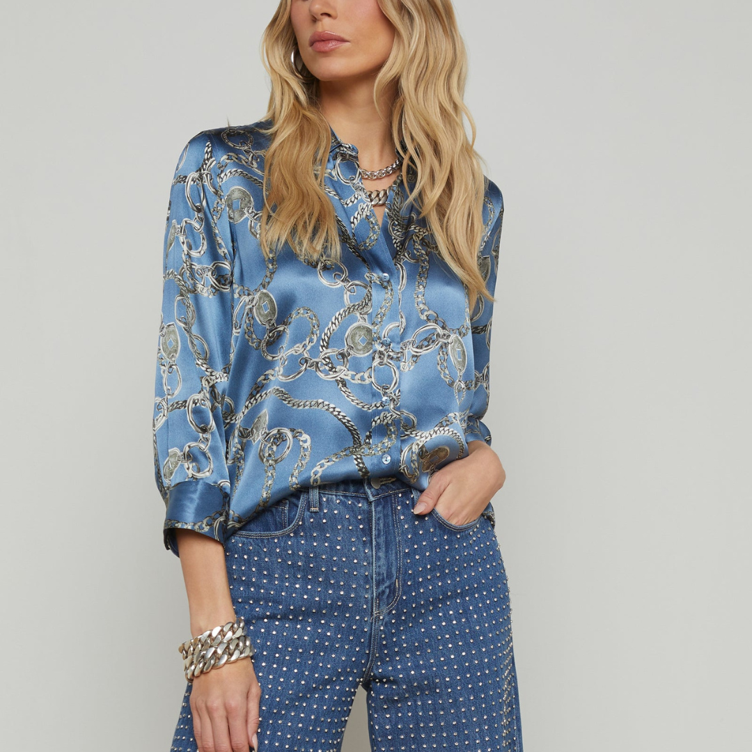 Meet the iconic silk button-down that belongs in every wardrobe. Our signature three-quarter sleeve shirt is back in ice blue with our signature chain print.