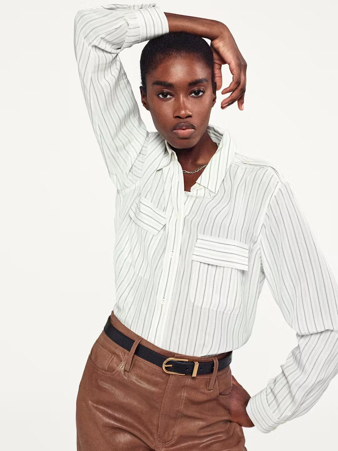 Spun from pure silk, this striped button-down feels as luxurious as it looks. The shirt has epaulets on either shoulder, two pockets at the chest, and billowy balloon sleeves that finish with classic cuffs. Style with a coordinating silk trouser, or daily denim for a laid-back take.
