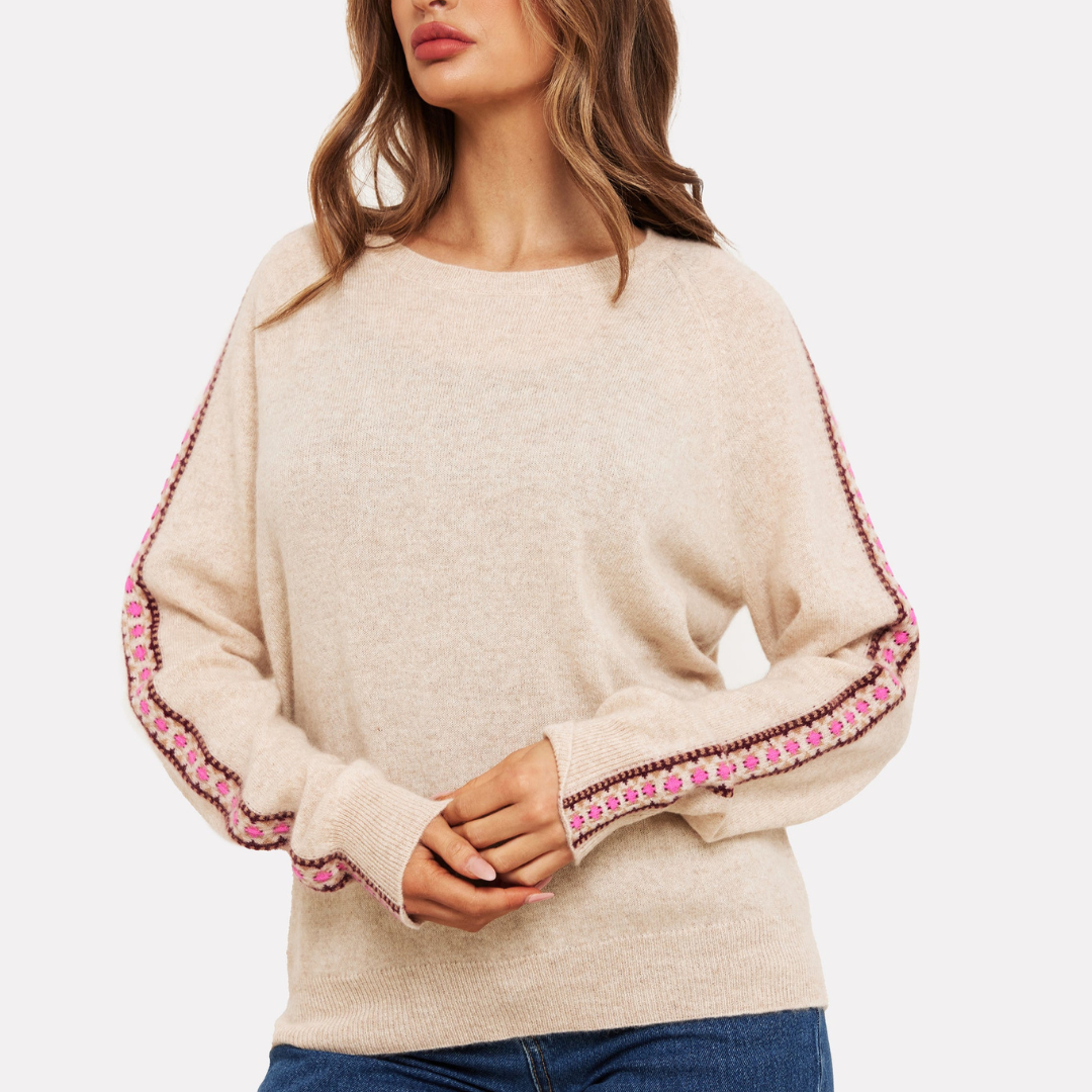 Add a touch of sophistication to your everyday wardrobe with this crew-neck sweater, featuring unique sleeve details that elevate its classic design. Made from 100% Grade-A Mongolian Cashmere, it offers unmatched softness, warmth, and durability.