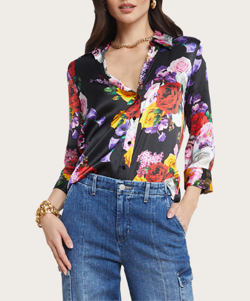 A timeless button-down shirt in a dark-floral silk charmeuse. Includes a three-quarter sleeve and high-low shirttail hem. The spread collar and back yoke are tailored to this feminine look. 100% Silk.