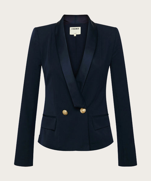 Crafted from supple stretch-suiting fabric with a beautiful handfeel, the Imogen blazer is a classic that belongs in every closet. This silhouette tapers from a strong shoulder to a fitted waist and flares to a vented hem for flattering definition. A luxe satin shawl lapel, full lining, and lustrous gold embossed-dome buttons take the look from day to evening. Pair with denim for a polished weekend look.
