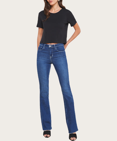 A classic high-rise jean in a dark-indigo wash with a vintage hand that creates an authentic vibe. Premium stretch denim includes REPREVE, a sustainable, high-performance recycled fiber. With a flattering contoured waistband, style is fitted through hip and thigh before draping to a straight leg with raw hem. Length can be altered. Contrast topstitching highlights five-pocket construction and front zip fly closure.