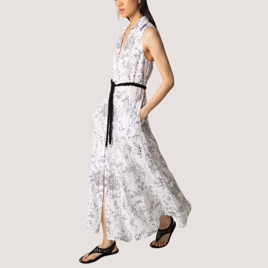 Elevated simplicity meets Italian craftsmanship in this refined white linen midi shirt dress by Purotatto, finished with striking black print detailing for modern contrast.
