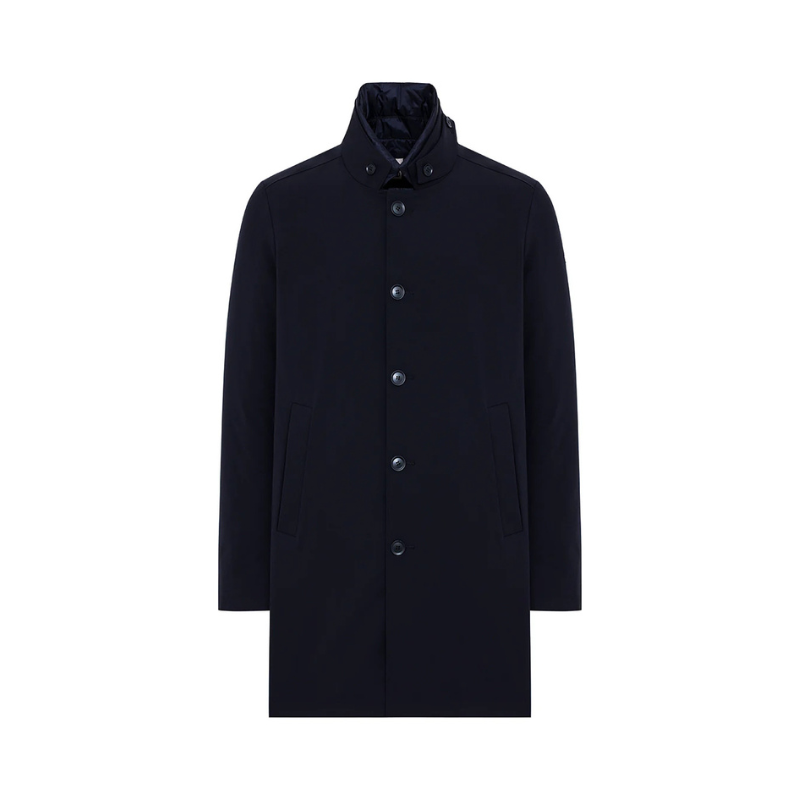 Coat in 2-Layer bi-stretch fabric with down padding, front closure with buttons and side welt pockets. The garment features a detachable bib with a snap closure, a stand collar and a chin strap fixed with buttons. Centrai vent at the back with hidden snap and sleeve bottom with slit and three-button closure. Multi-functional pockets with zipper and reflective details on the inside.