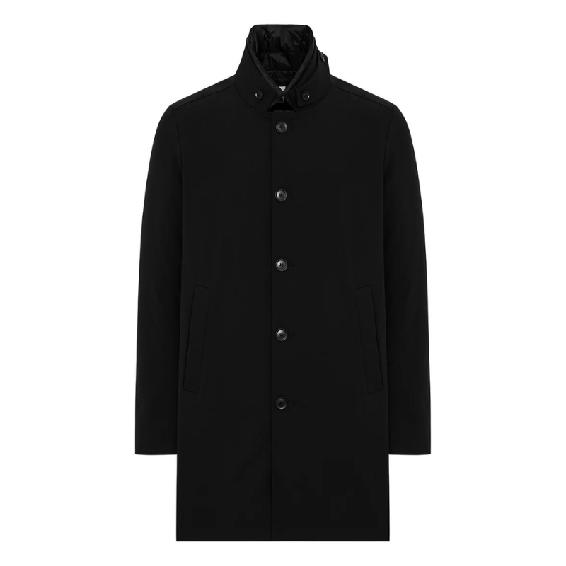 Coat in 2-Layer bi-stretch fabric with down padding, front closure with buttons and side welt pockets. The garment features a detachable bib with a snap closure, a stand collar and a chin strap fixed with buttons. Centrai vent at the back with hidden snap and sleeve bottom with slit and three-button closure. Multi-functional pockets with zipper and reflective details on the inside.