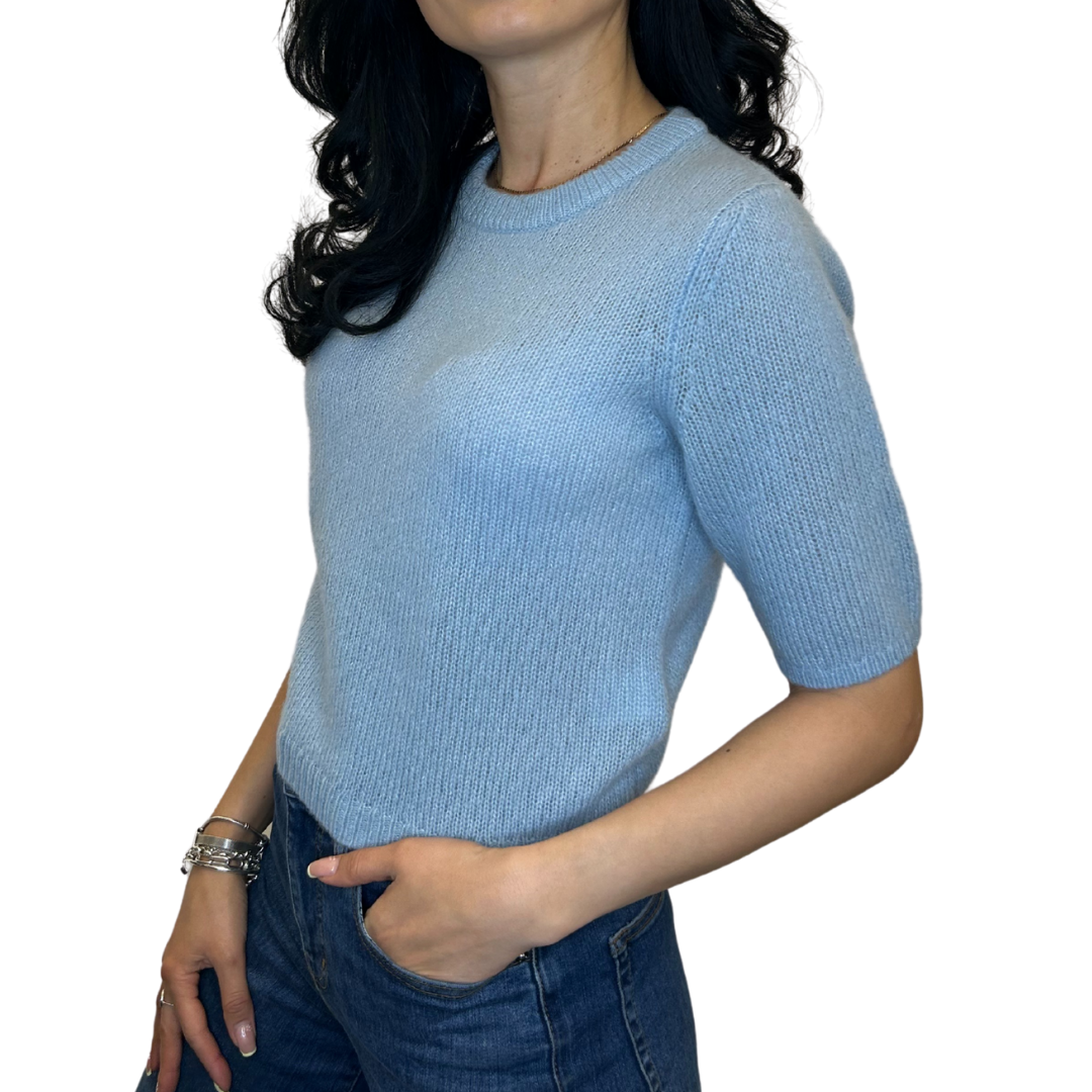 Indulgently soft and beautifully lightweight, this sky blue short-sleeve knit is crafted from a luxurious blend of silk and cashmere, offering refined comfort with a subtle sheen. A timeless essential designed for effortless elegance all year round.