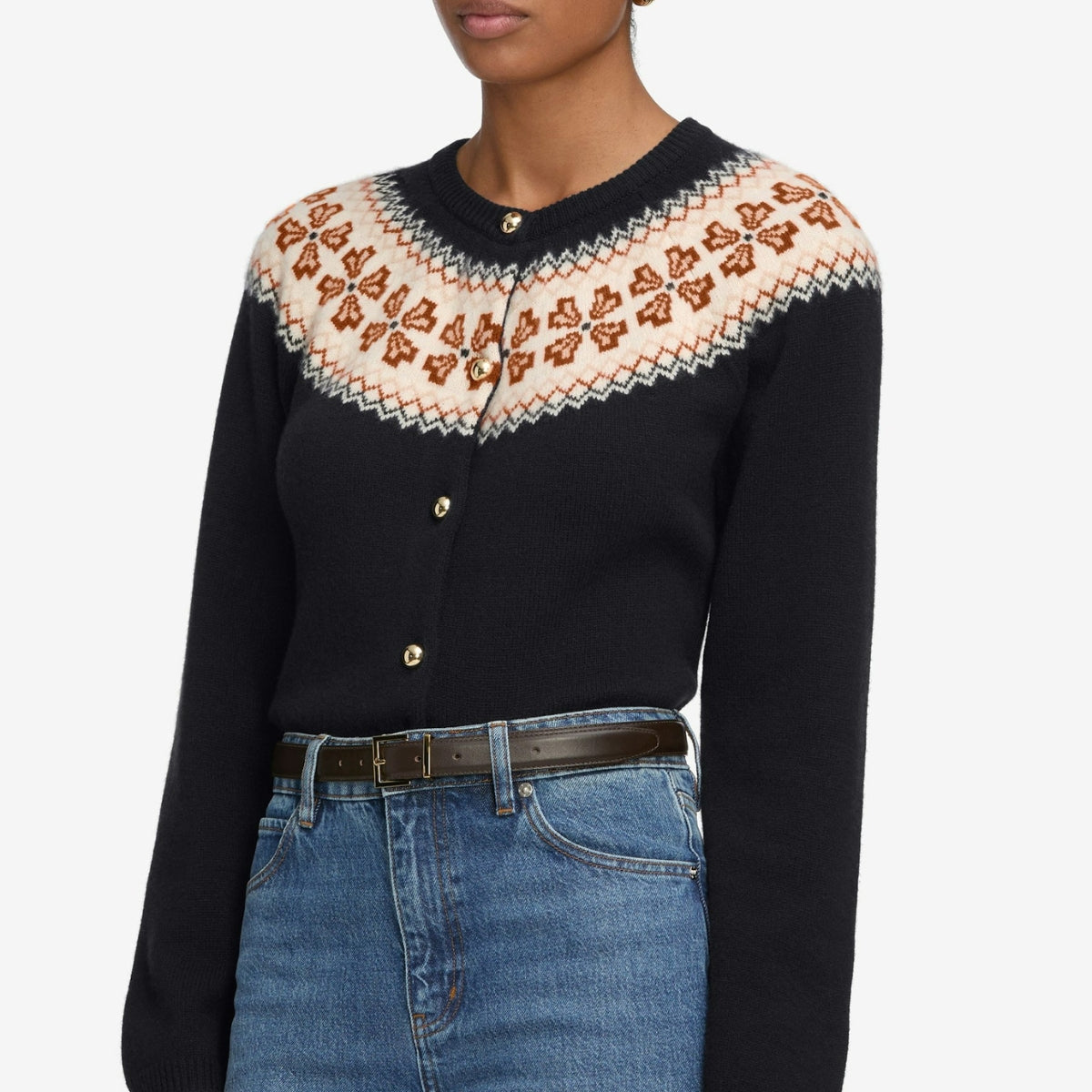 Crafted from pure cashmere, this cardigan pairs a nostalgic Fair Isle pattern with delicate gold buttons for a modern, feminine take on heritage knits.